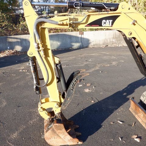 2005 CATERPILLAR Model 303CR Mini Hydraulic Excavator, s/n DMA03985, powered by Mitsubishi 3 cylinder diesel engine and hydraulic drive, equipped with swing boom, 5′ dipper stick, auxiliary hydraulics, Cat 18″ digging bucket, Amulet hydraulic thumb, 61″ backfill blade, enclosed cab, and 12″ rubber tracks. In good condition with good undercarriage. (Meter Reads 05,360 Hours) (Unit # E122)