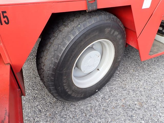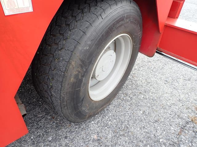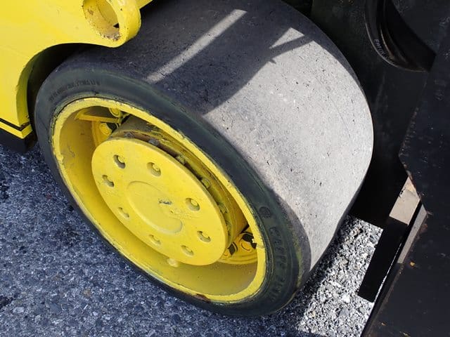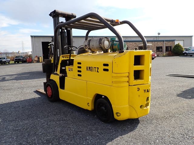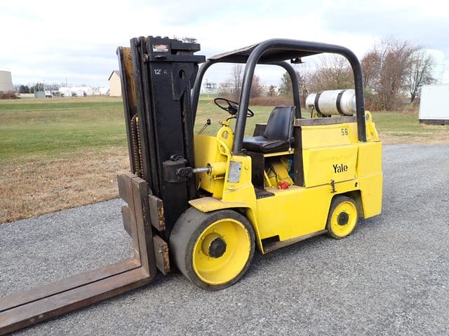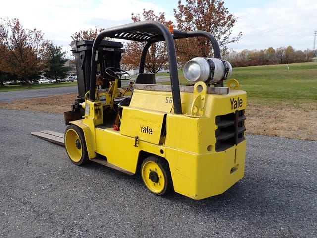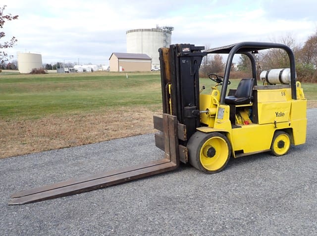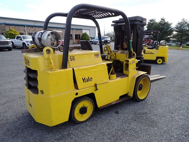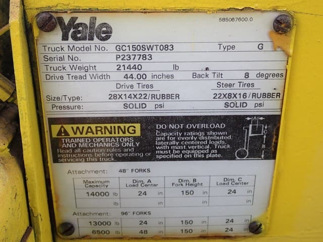 YALE Model GC150SWT083, 14,000 Lb Solid Tired Forklift, s/n P237783, powered by 6 cylinder LP gas engine and shuttle transmission, equipped with 148″ 3-stage mast, 82″ retracted height, 8′ forks, and FOPS canopy. In good condition with good tires. (Meter Reads 00,679 Hours) (13,000 lb Capacity on Plate, with 96″ Forks) (Propane Bottle Not Included) (Unit # 56)
