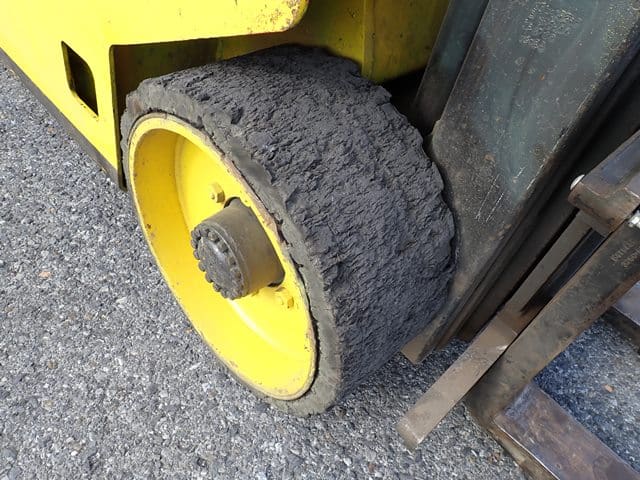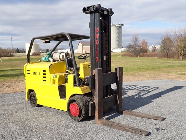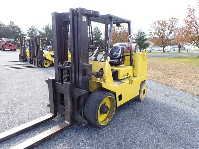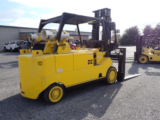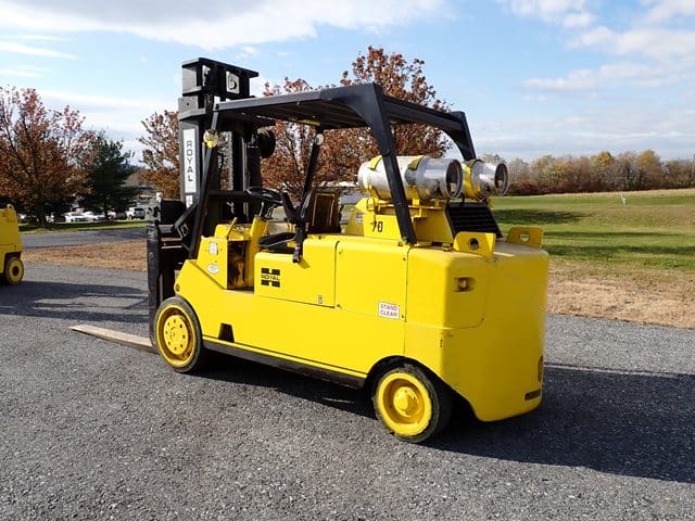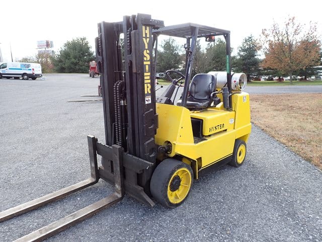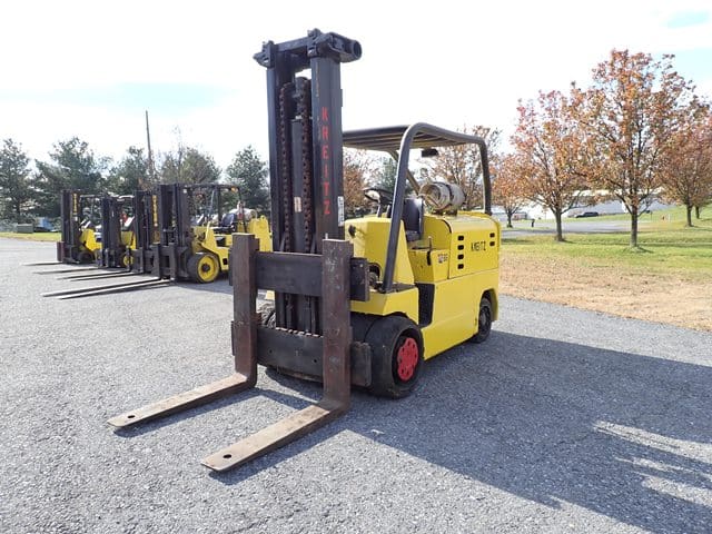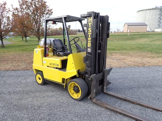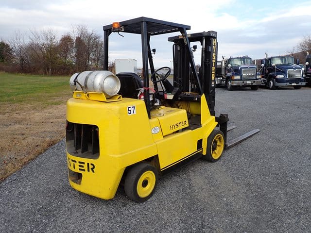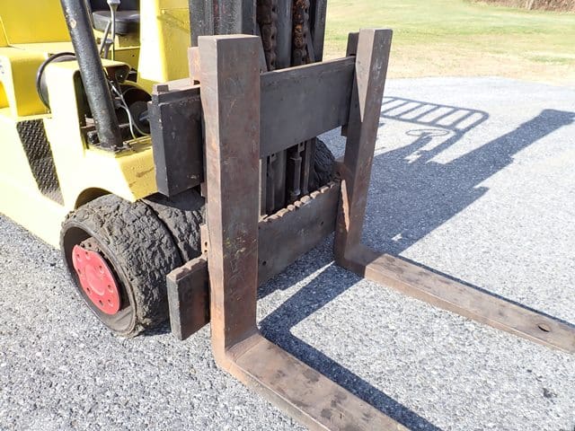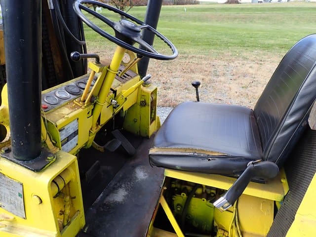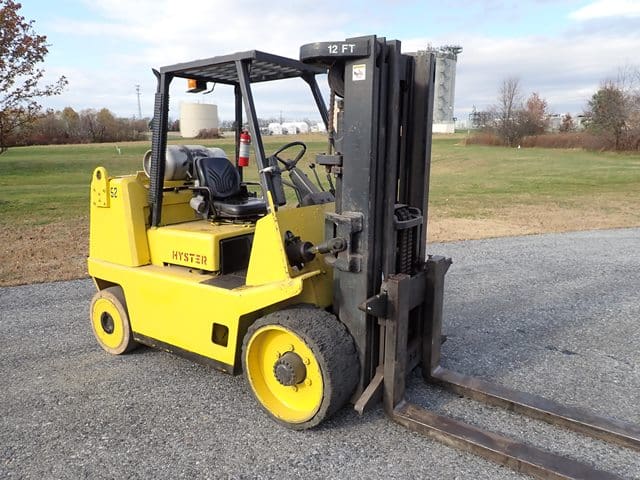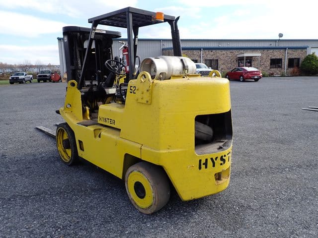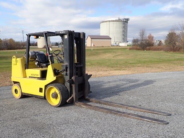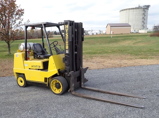 1988 HYSTER Model S80XL, 8,000 Lb Solid Tired Forklift, s/n D004V02439J, powered by 6 cylinder LP gas engine and shuttle transmission, equipped with 172″ 3-stage mast, 72″ forks, and FOPS canopy. In good condition with good tires. (Meter Reads 1,042 Hours) (No Side Shift) (Propane Bottle Not Included) (Unit # 57)