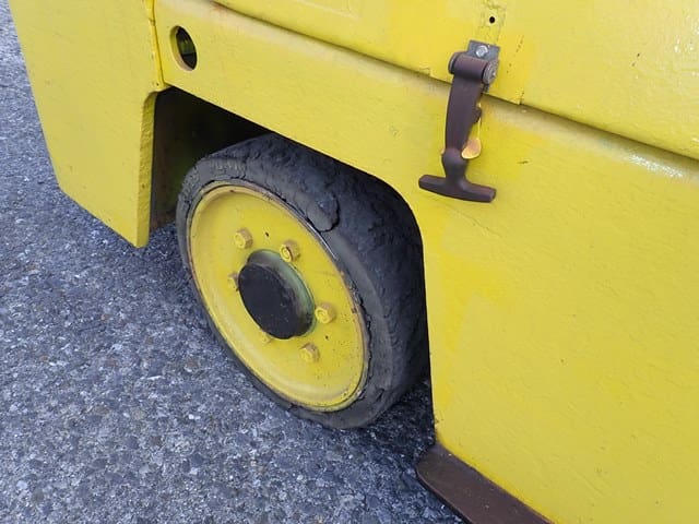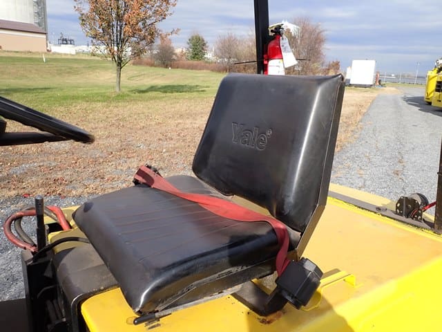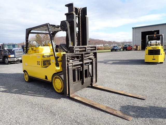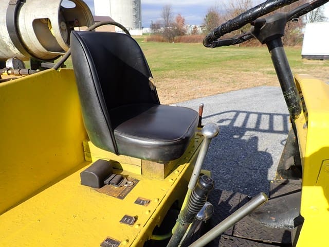 YALE 28,000 Lb Solid Tired Forklift, s/n unknown, powered by GM V-6 LP gas engine and 2 speed shuttle transmission, equipped with 10′ 2-stage mast, 118″ retracted height, 4′ forks, and FOPS canopy. In good condition with fair tires. (Meter Reads 9,329 Hours) (No ID Plate) (No Side Shift) (Propane Bottle Not Included) (Unit # 66)