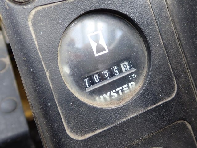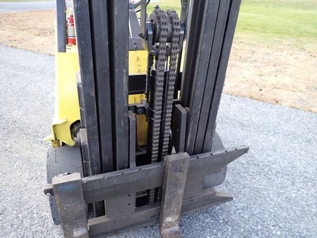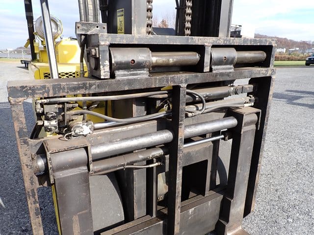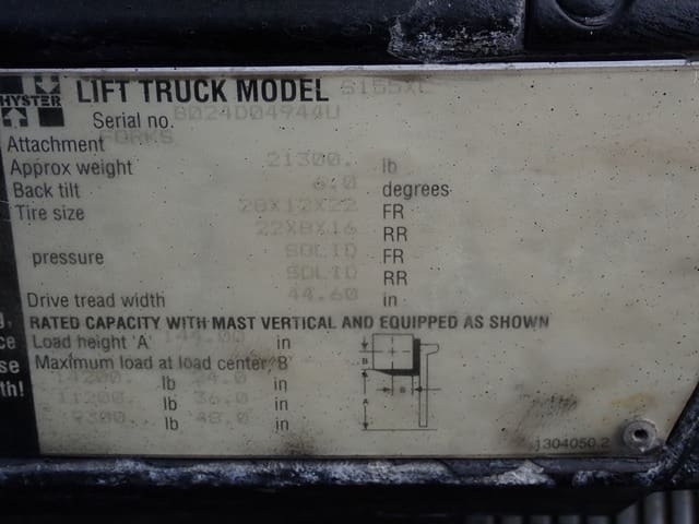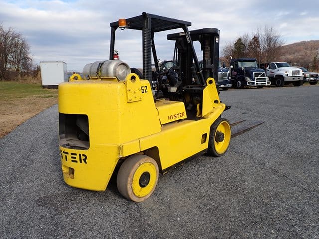 1997 HYSTER Model S155XL, 15,000 Lb Solid Tired Forklift, s/n B024D04944U, powered by Vortec V-6 LP gas engine and 3 speed shuttle transmission, equipped with 144″ 3-stage mast, 85″ retracted height, 8′ forks, and FOPS canopy. In good condition with fair tires. (Meter Reads 4,846 Hours) (No Side Shift) (14,200 lb Capacity on Plate) (Propane Bottle Not Included) (Unit # 52)