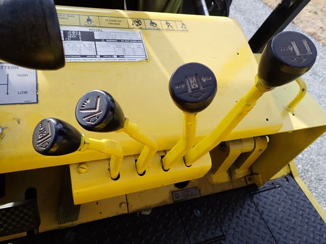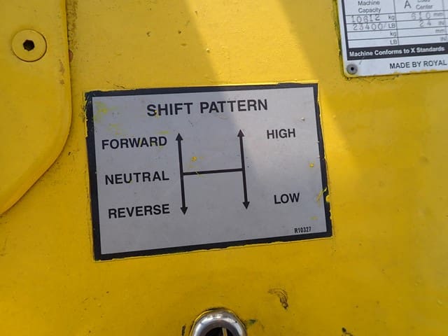 ROYAL Model T250B, 25,000 Lb Solid Tired Forklift, s/n 788L182, powered by V-8 LP gas engine and hi-lo shuttle transmission, equipped with 99″ 2-stage mast, 115″ retracted height, 6′ forks, side shift, fork positioner, and FOPS canopy. In good condition with good tires. (Meter Reads 01,593 Hours) (23,400 lb Capacity on Plate) (Propane Bottle Not Included) (Unit #70)