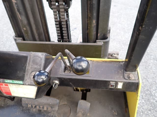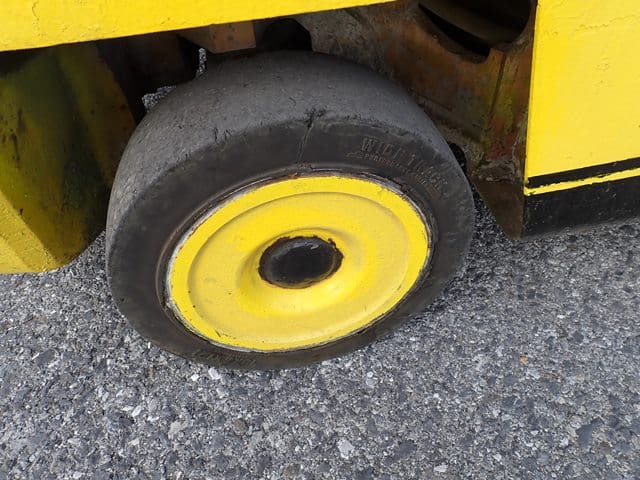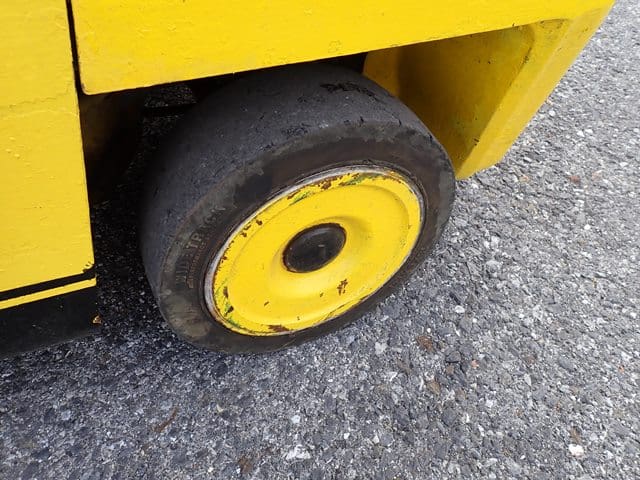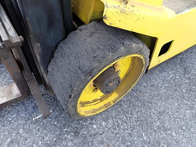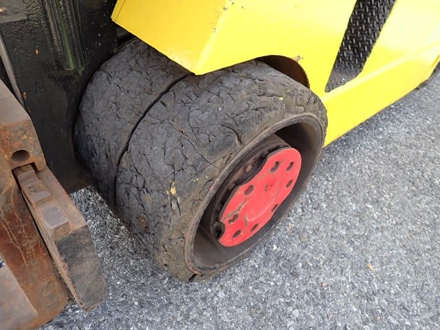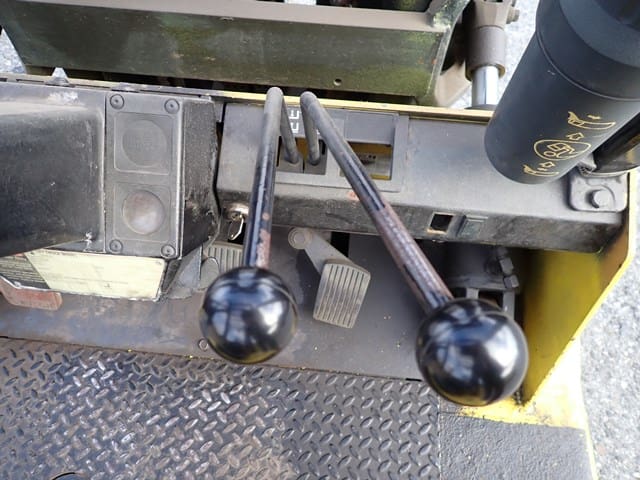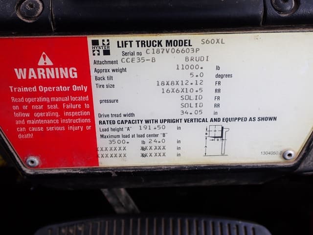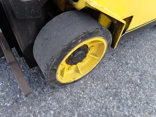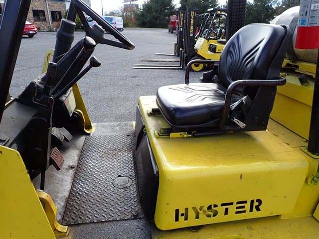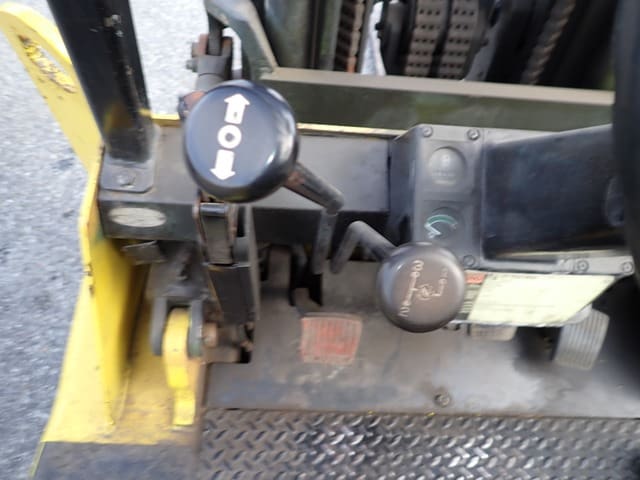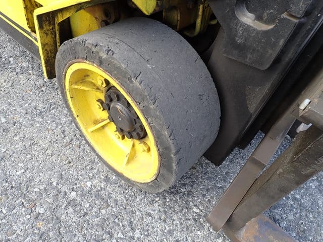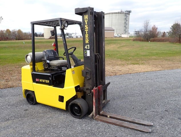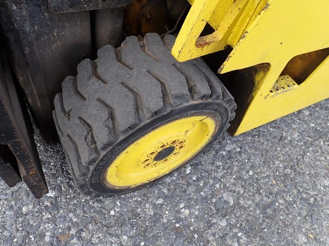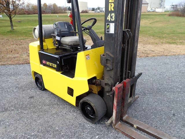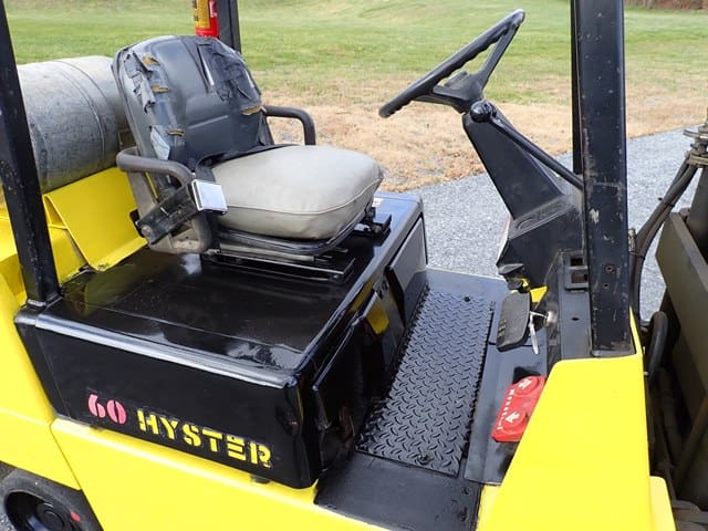 1993 HYSTER Model S60XL, 3,500 Lb Solid Tired Forklift, s/n C187V06603P, powered by 4 cylinder LP gas engine and hydrostatic transmission, equipped with 191.5″ 3-stage mast, 87″ retracted height, 42″ forks, and FOPS canopy. In good condition with good tires. (Meter Reads 7,055 Hours) (No Side Shift) (Propane Bottle Not Included)