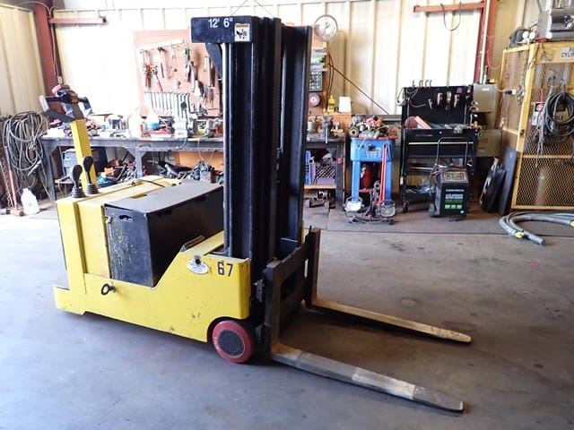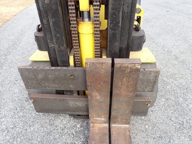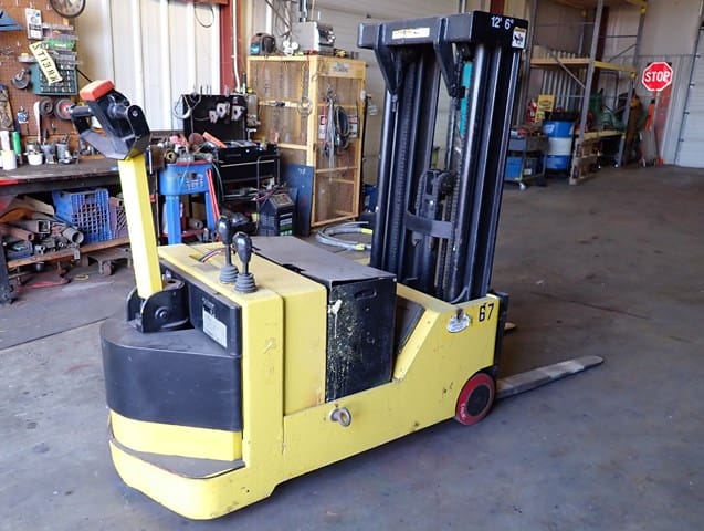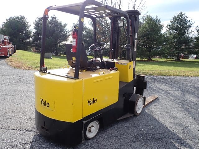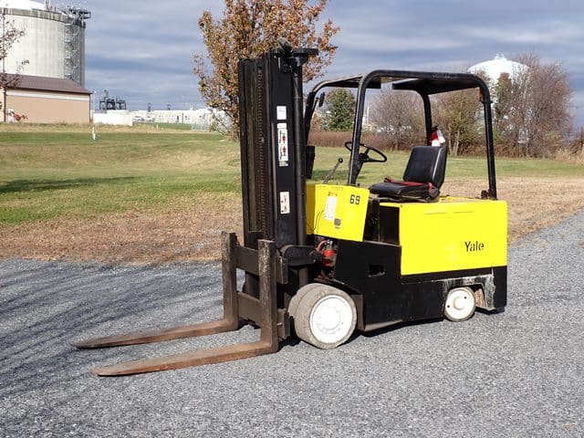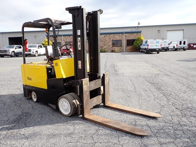 YALE Model ERC100HBN365V095, 10,000 Lb Electric Solid Tired Forklift, s/n N400228, powered by 36 volt battery, equipped with 136″ 2-stage mast, 94″ retracted height, 4’6″ forks, wall mounted charger, and FOPS canopy. In good condition with good tires. (Meter Reading N/A) (No Side Shift) (Unit# 69)