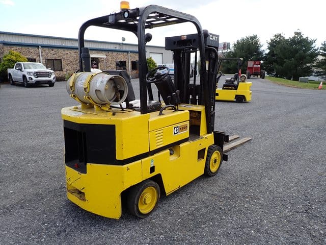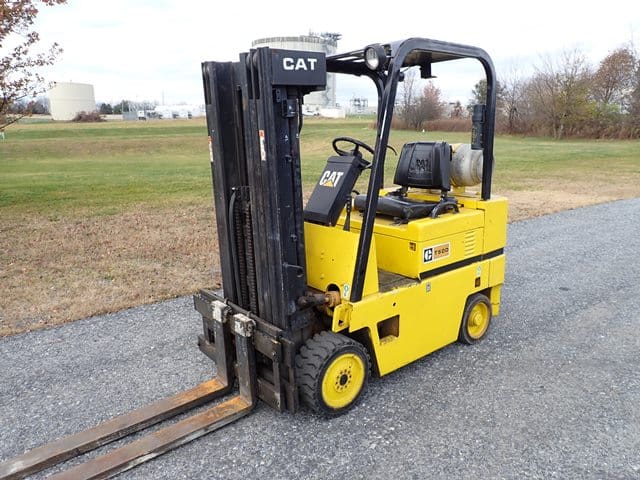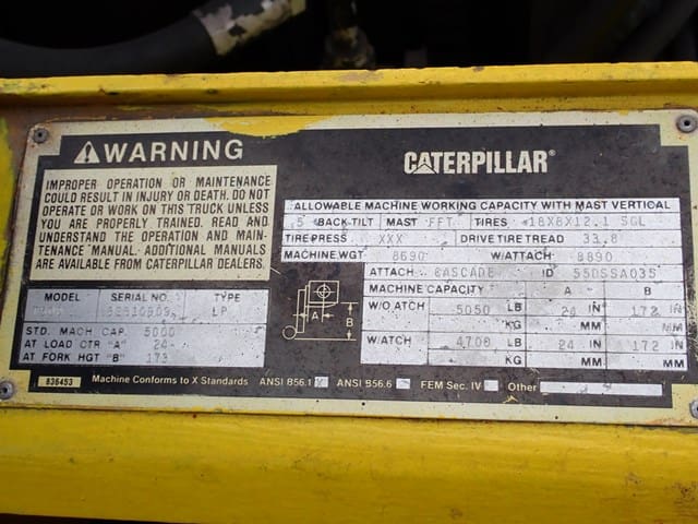 1991 CATERPILLAR Model T50D, 5,000 Lb Solid Tired Forklift, s/n 8EB10909, powered by 4 cylinder LP gas engine and shuttle transmission, equipped with 172″ 3-stage mast, 77″ retracted height, 6′ forks, and FOPS canopy. In good condition with good tires. (Meter Reads 1,822 Hours) (Propane Bottle Not Included)