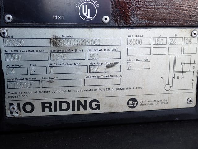BT PRIME MOVER Model CSX30, 3,000 Lb Walk Behind Electric Forklift, s/n 2821900, 24 volt DC power, equipped with 150″ 3-stage mast, 71″ retracted height, and 39″ forks. In good condition. (Meter Reads 54 Hours) (Unit #67)