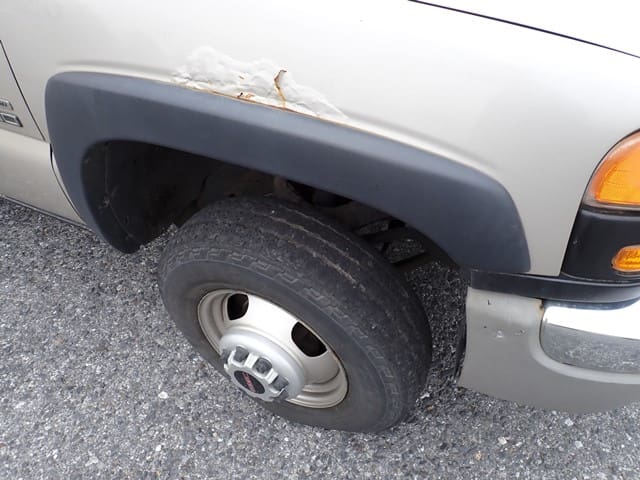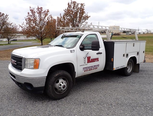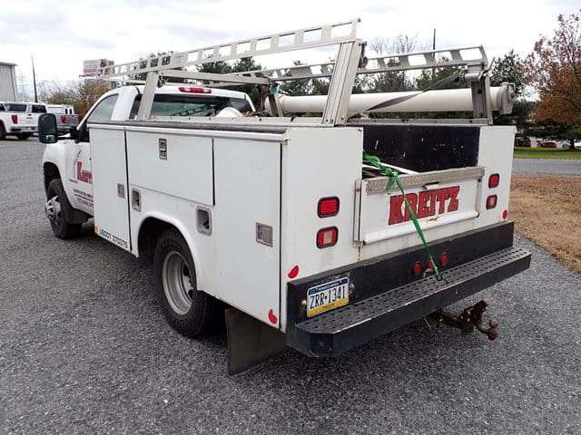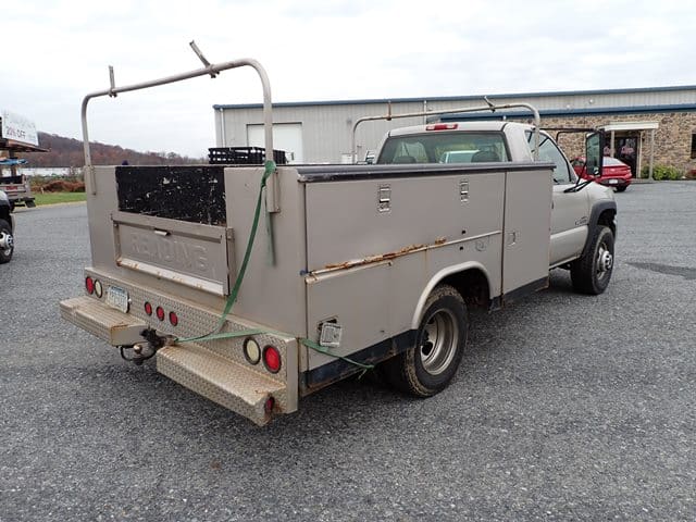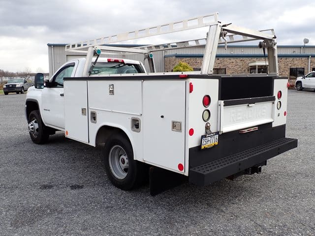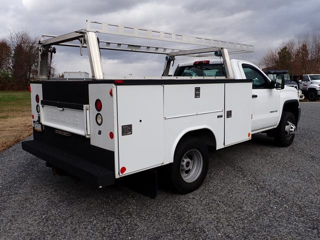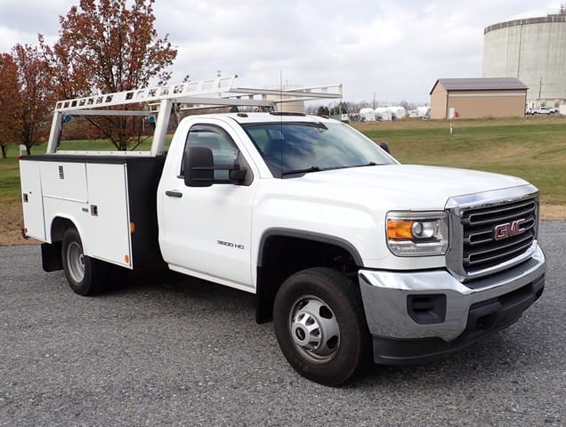 2015 GMC Model 3500HD Utility Truck, VIN# 1GD312CG8EF130395, powered by Vortec 6.0L gas engine and automatic transmission, equipped with Reading 9′ open utility body with material rack, dual rear wheels, tow package, power windows and locks, cruise control, and air conditioning. In good condition with good tires. (Odometer Reads 125,922 Miles) (Unit #87)