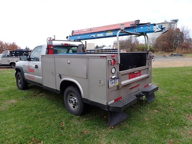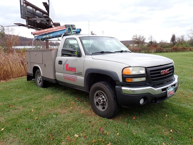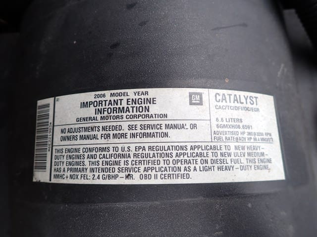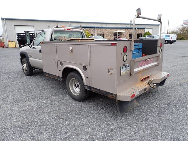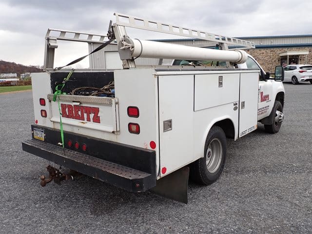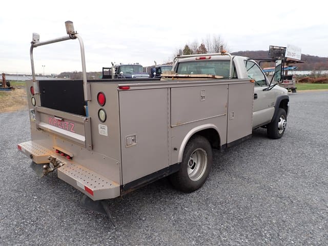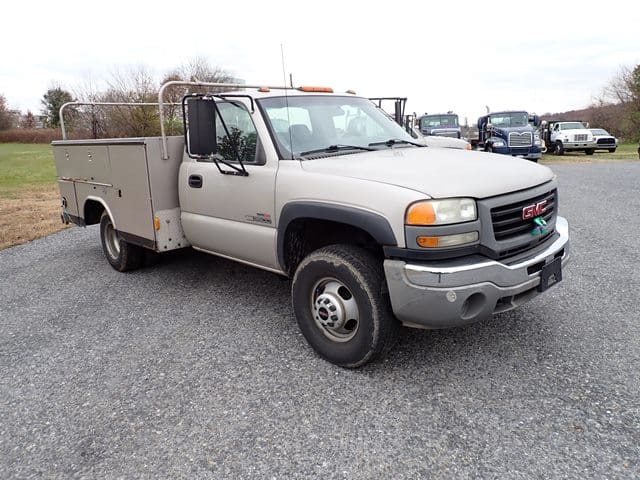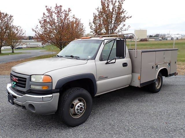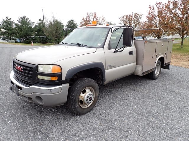 2006 GMC Model 3500 Utility Truck, VIN# 1GDJC34D56E221675, powered by Duramax 6.6L diesel engine and Allison automatic transmission, equipped with Knapheide 9′ open utility body, ladder rack, dual rear wheels, tow package, and air conditioning. In good condition with good tires. (Odometer Reads 302,052 Miles) (Unit #23)