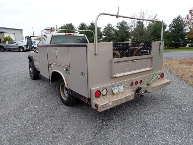 2005 GMC Model 3500 Utility Truck, VIN# 1GDJC342X5E166234, powered by Duramax 6.6L diesel engine and automatic transmission, equipped with Reading 9′ open utility body, material rack, tow package, dual rear wheels, and air conditioning. In fair to good condition with good tires. (Odometer Reads 297,387 Miles) (Ripped Headliner) (Unit #20)